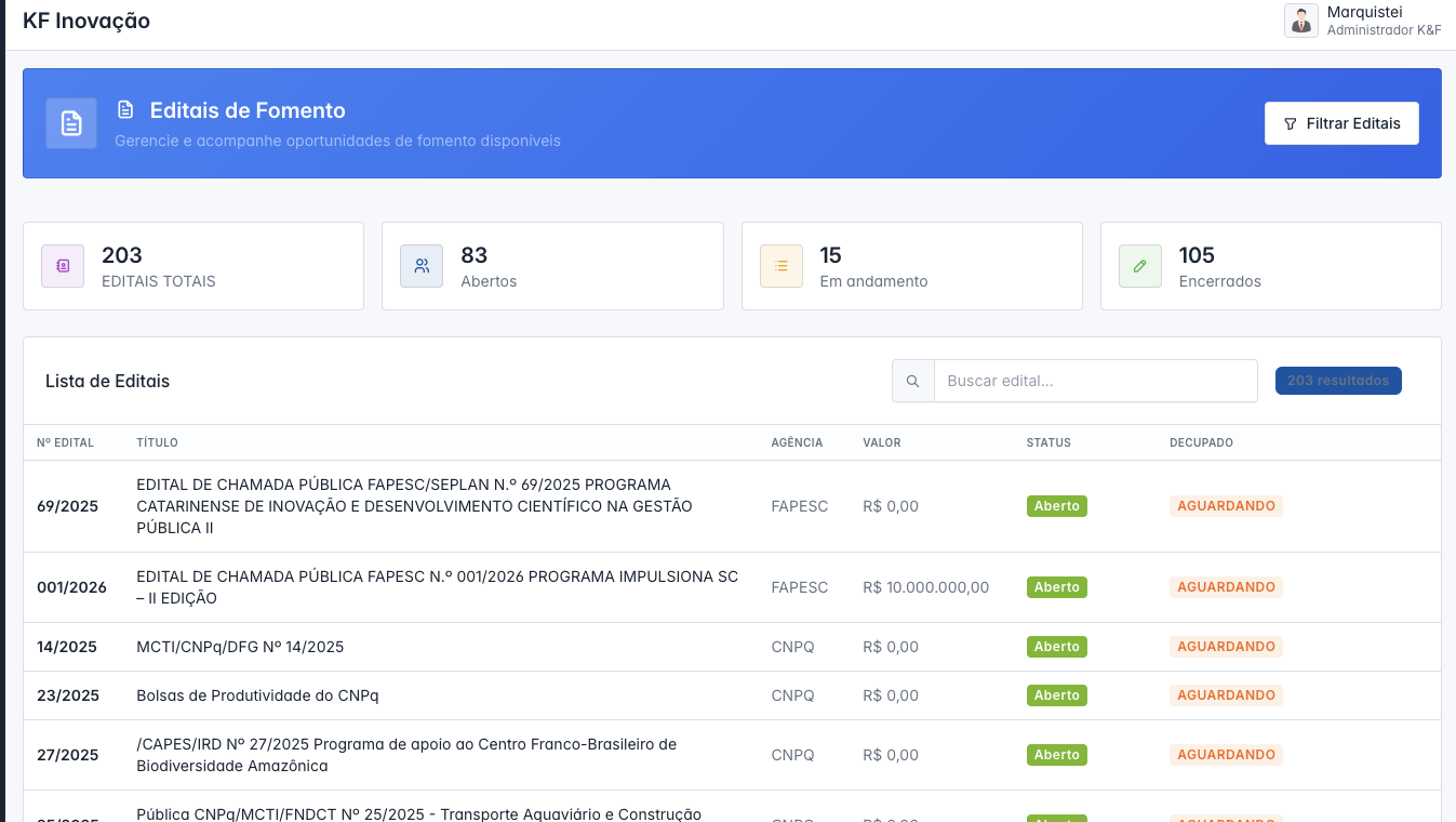 Monitora continuamente oportunidades de fomentos para os projetos de interesses cadastrados.